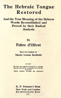 The highlights of the Hebraic Tongue Restored are the lexicon of Hebrew roots, and then – based on that – d’Olivet’s remarkable translation and exposition of the first section of the Book of Genesis, the cosmology of Moses. This is a tour de force in the application of the root ideas exposed in the lexicon and truly one of the most profound expositions of Genesis ever undertaken by either Jew or Gentile. In his younger years the present writer spent night after night delving into the mysteries revealed by Monsieur d’Olivet, and it is probably because these mysteries were so arresting and so compelling – so metaphysically fundamental – that they made a lasting impression upon him. Hebrew speaks to the heart. It is like no other language. The Koran boasts that its Arabic is easy to remember, but for the present writer the claim is even truer of the Bible's Hebrew. Terse, concentrated, potent with meaning, it seems a language just made to carry significances that extend beyond time and space. No study of the language makes this clearer than d'Olivet's Hebraic Tongue Restored.