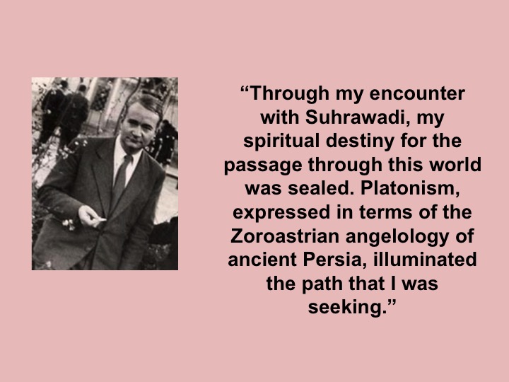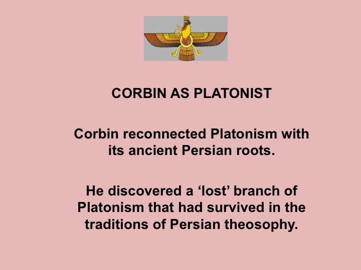 Further to the previous slide: Corbin as Platonist. This is the present writer's interest in Corbin. Others are drawn to Corbin for other reasons, but for the present writer Corbin is of great interest because he is a modern Platonist and opened a dimension of Platonism generally neglected in the West.