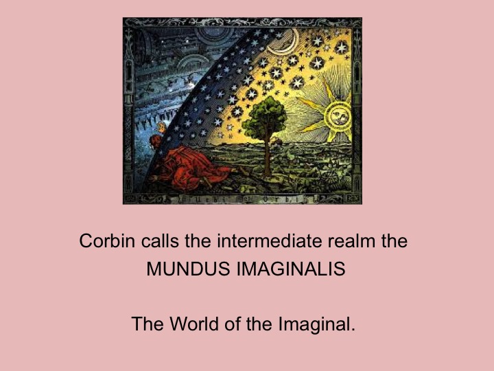 At this point in the talk we introduced Corbin's terminology for the intermediate realm - the IMAGINAL. He dubbed that realm the Mundus Imaginalis, the World of the Imaginal.