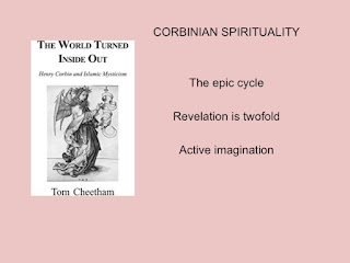 At this point, after some discussion on the abnove matters, the speaker directed listeners to the work of Tom Cheetham as a useful introduction to Henry Corbin. Corbin's own writing is quite dry and scholarly. He is a painstaking textual scholar. For most people it is best to approach Corbin through a writer such as Tom Cheetham. A number of themes in Corbin will then open out from there: the monotheisms as an epic cycle, the twofold nature of revelation, the practices of the active imagination, amongst others. The talk then considered each of these themes briefly: